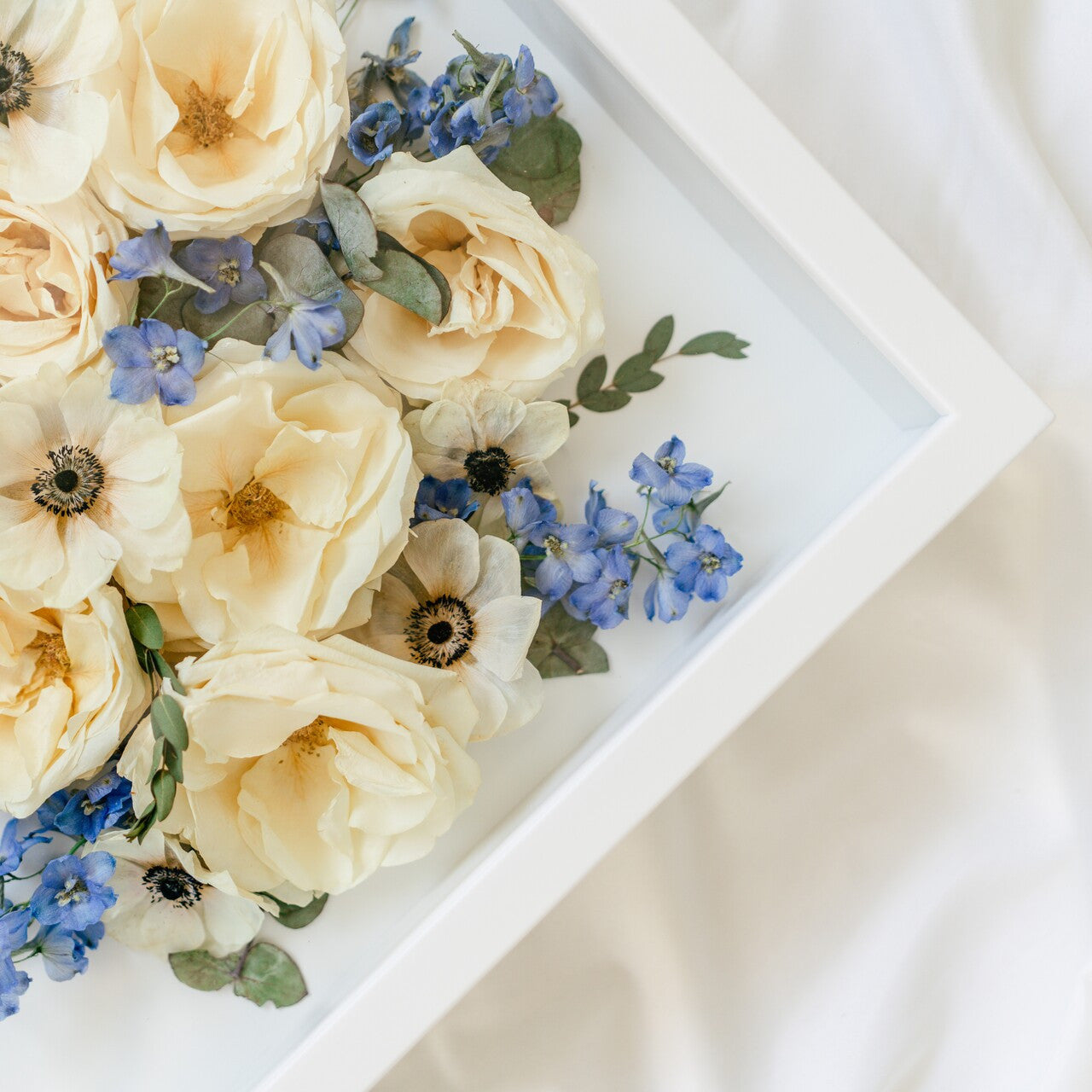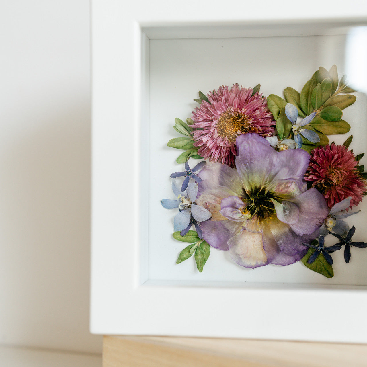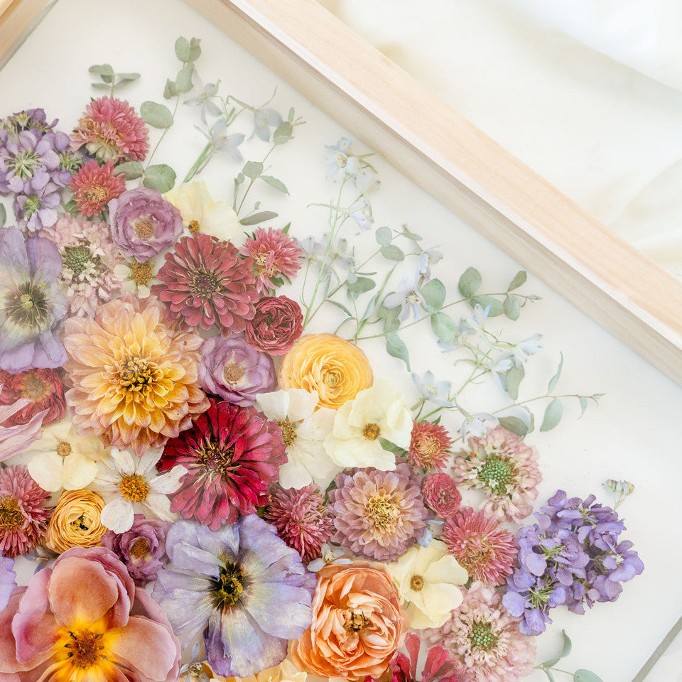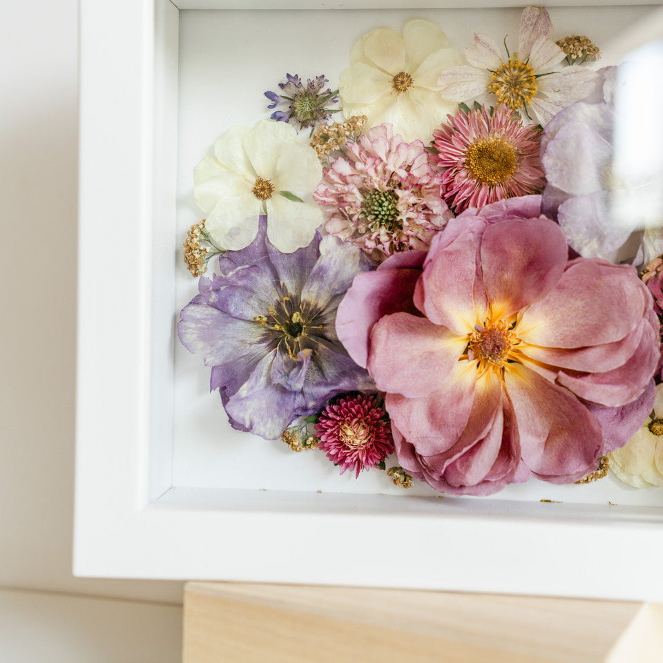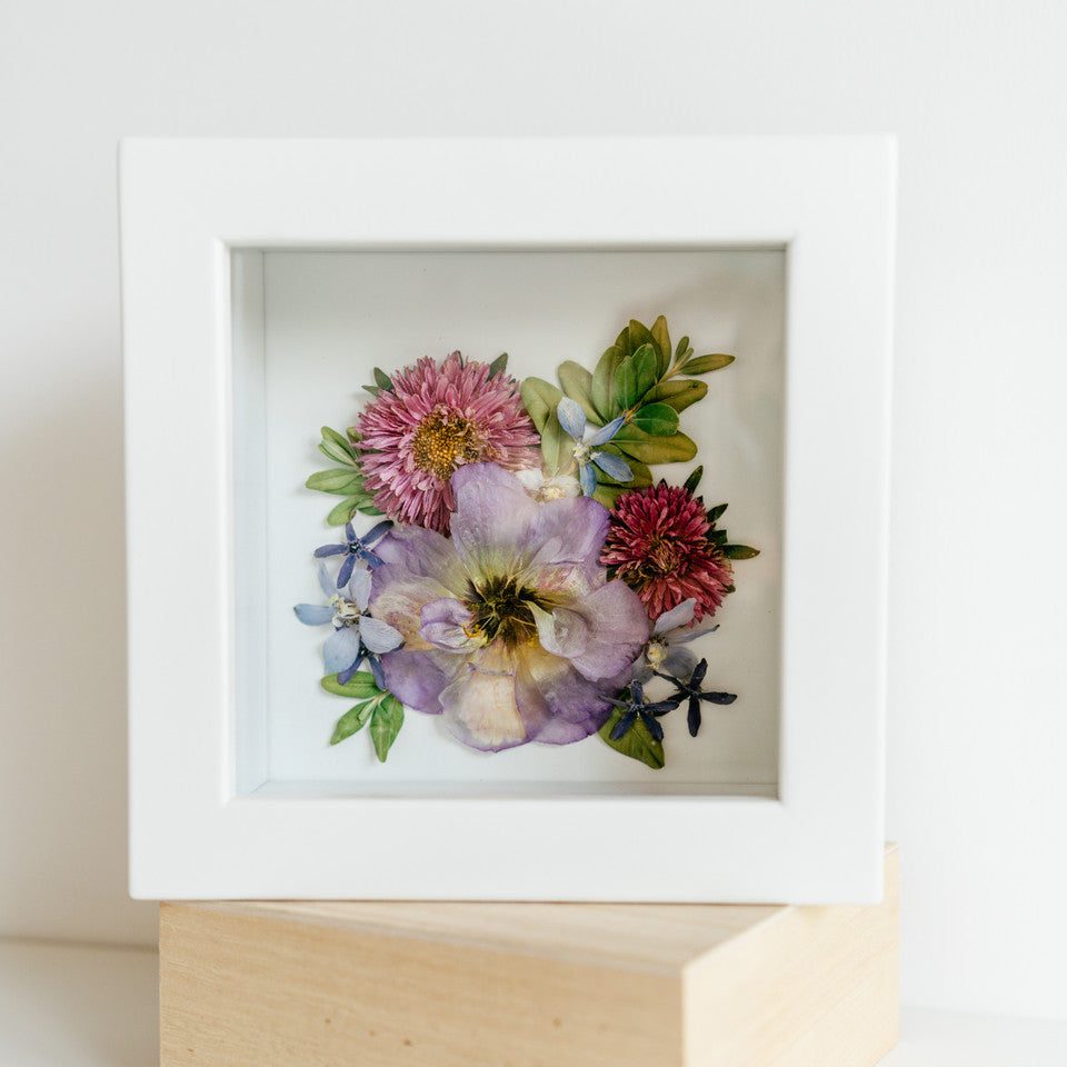 This shadow box design displays the front of your blooms instead of our classic shadow box option, which displays the blooms on their side and shows more of the stems. This option is especially great for those with large and full bouquets or arrangements.
