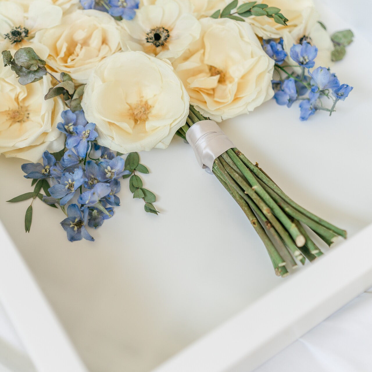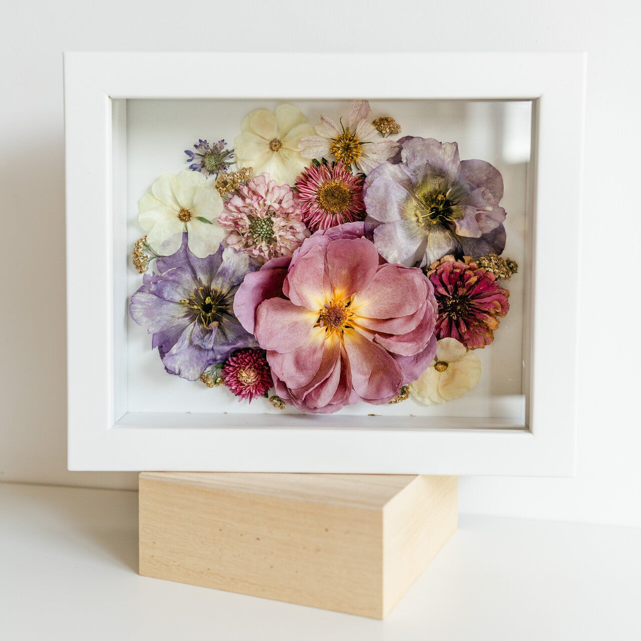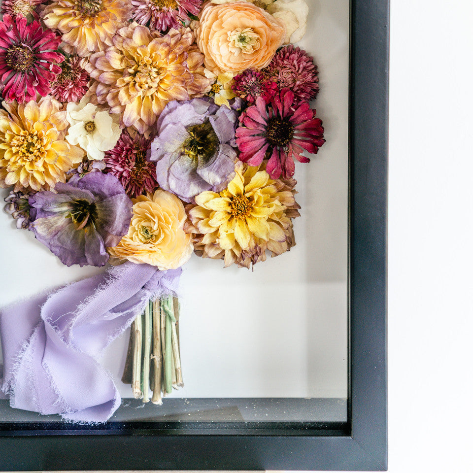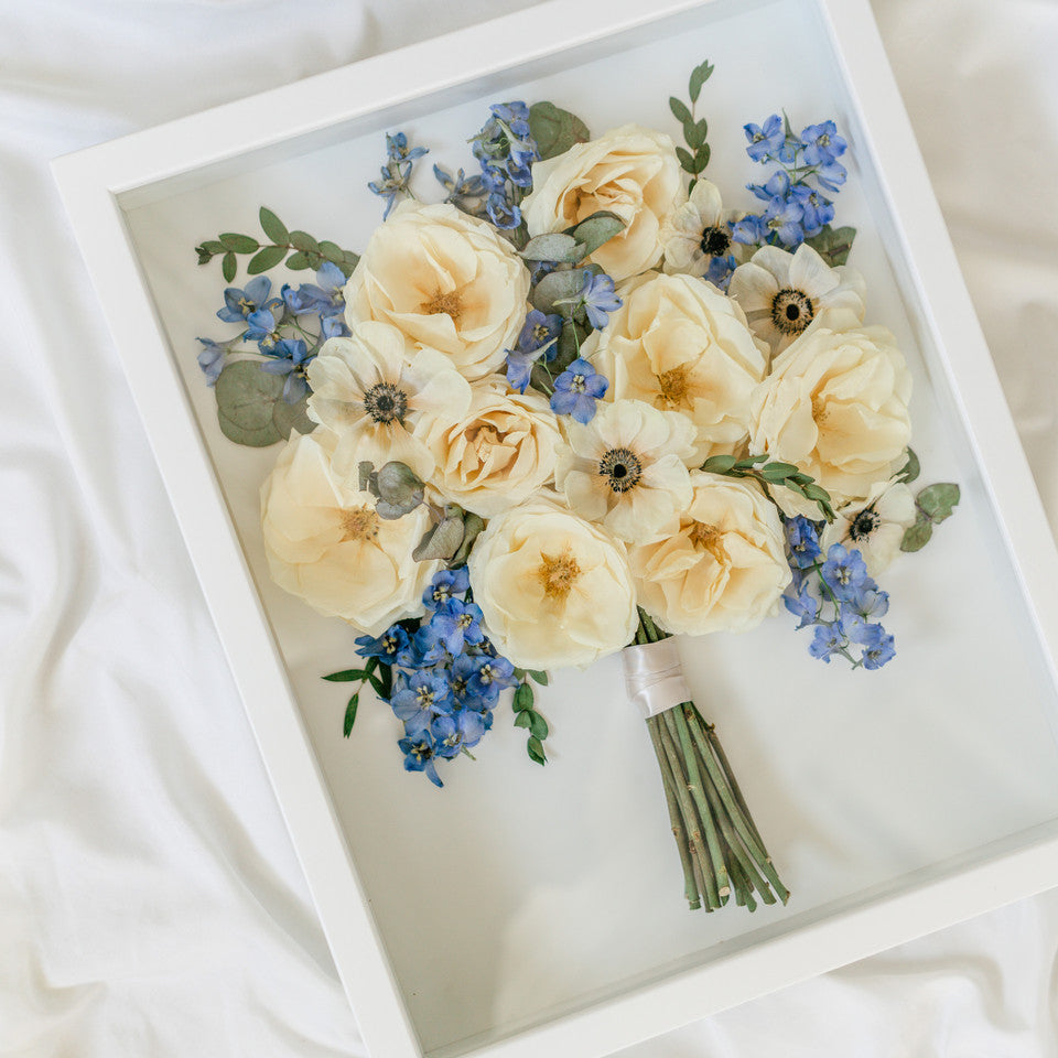 For the frontal facing shadow box we use different flower drying methods to preserve the flower’s natural shape and color so that your preserved flowers look just like they did on your wedding day! Please keep in mind that colors may change and natural browning can occur over time. In order to preserve the shape and color of these blooms the best we can, we need your flowers as soon as possible after your event.